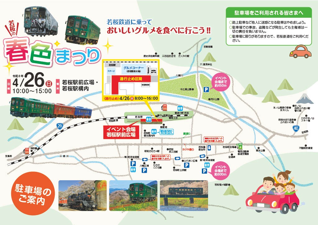 若桜駅前広場では、キャラクターショーやステージショー、グルメコーナーが行われ、若桜駅構内では駅構内を無料開放の上、SLトロッコの乗車体験などを行います。