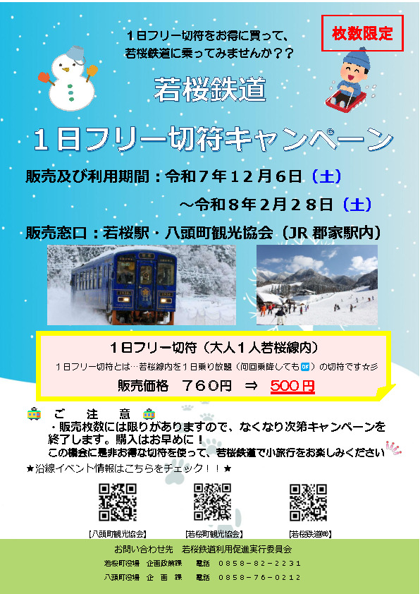 令和7年12月6日(土)~令和8年2月28日(土)の間1日フリー切符が通常760円のところ、500円でご購入いただけます。